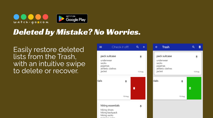Función de papelera: ¿Eliminaste accidentalmente un elemento? ¡No te preocupes! La función de papelera te permite restaurar elementos eliminados, asegurando que nunca pierdas permanentemente elementos importantes de tu lista de verificación.